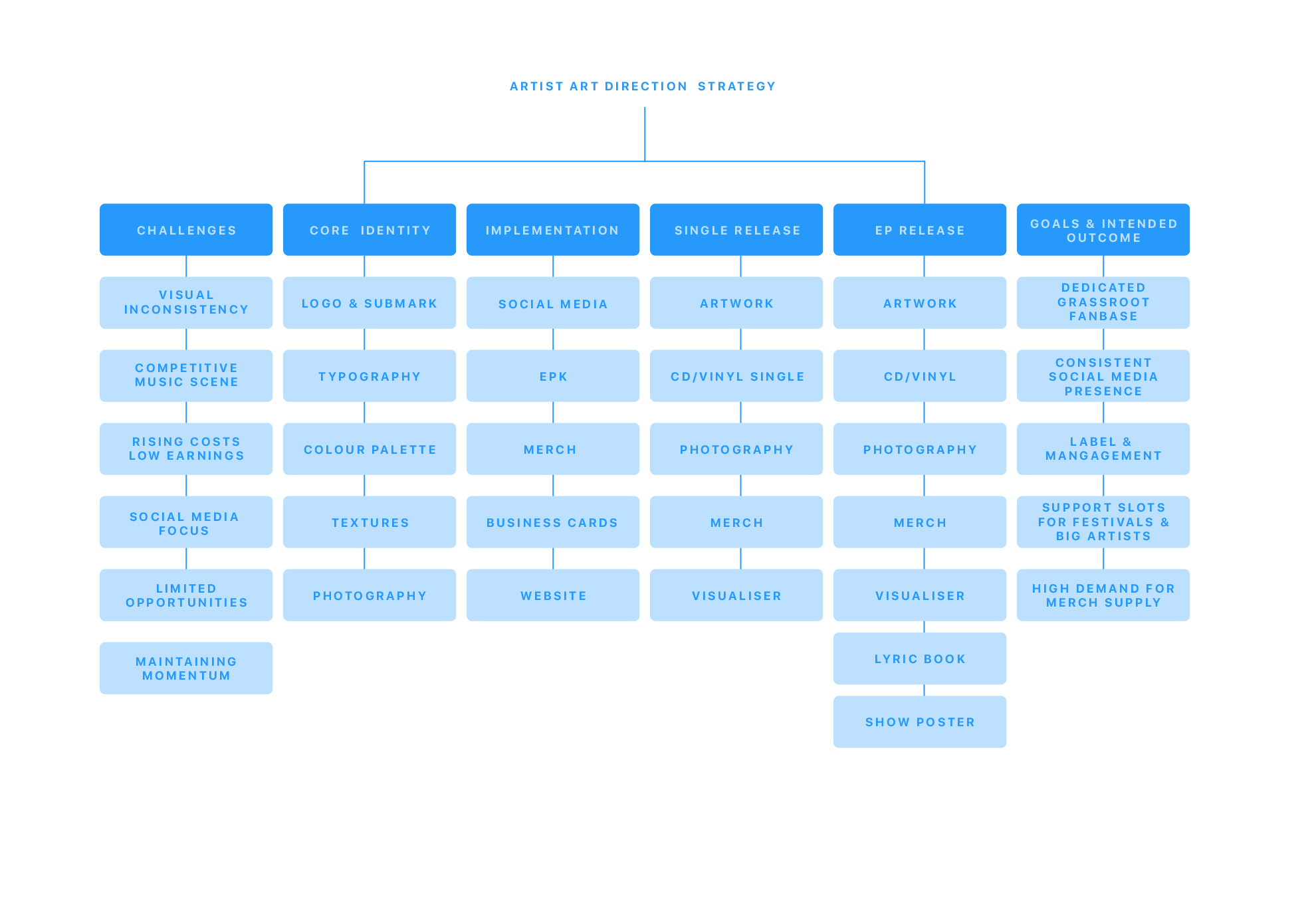 In response to the challenges The Fiends were facing, particularly visual inconsistency and the need to stand out in a competitive music scene, I developed a strategy focused on building a strong, cohesive visual identity.